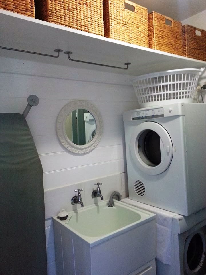 Within a couple of days the rest was done. The cupboard was moved in, hubby found two white ceramic tiles left over from the kitchen to put above the laundry sink and installed a shelf the length of the wall over the sink also. I bought one basket to match the other four I already had and they found their home on the shelf. We installed hooks to hang up the ironing board, clothes airer and mop and broom, and some rails to hang some washing .